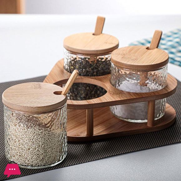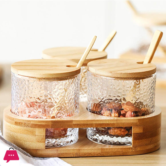 3 Glass Seasoning Jar Set Hammer Mesh Kitchen Condiment Box with Bamboo Lids Tray Spoon Seasoning Container for Spice Salt Sugar