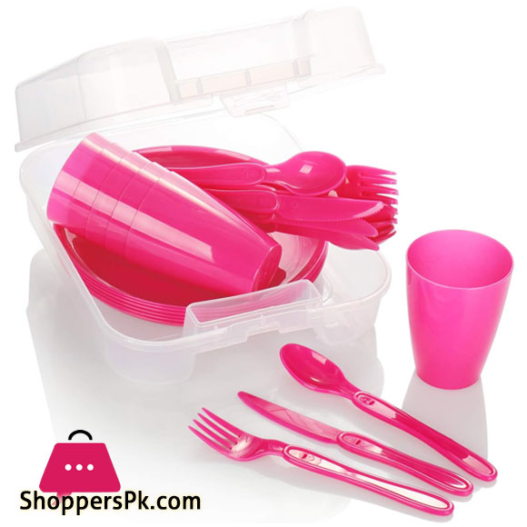 - Box contents: 1 x picnic box, 6 x plates, 6 x cups, 6 x knives, 6 x forks, 6 x spoons. Dimensions: picnic box approx. 26 x 23 x 10 cm (L x W x H), plate approx. 21 x 1.5 cm (diameter x height), cup approx. 7.5 x 9.5 cm (diameter x height), knife approx. 18.5 x 1.5 cm (L x W). Fork approx. 18.5 x 3 cm (L x W), spoon approx. 18.5 x 3.5 cm (L x W). Material: plastic. Colour: blue.green.pink