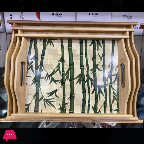 3Pcs Set Of Thailand Made Wooden Bamboo Serving Tray With Handles & Printed Design