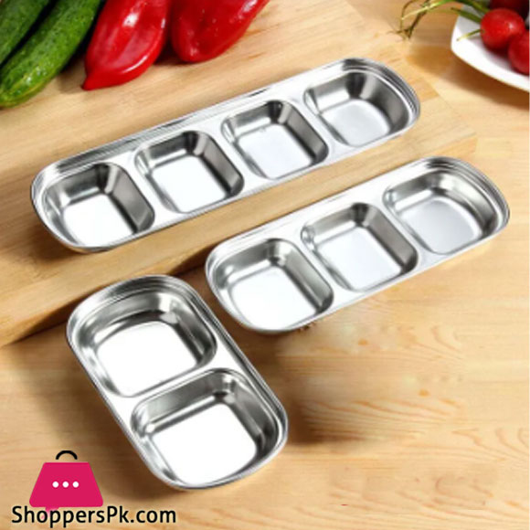 - Multi‑purpose stainless steel dinner plate with compartment design. It can hold seasoning and snacks