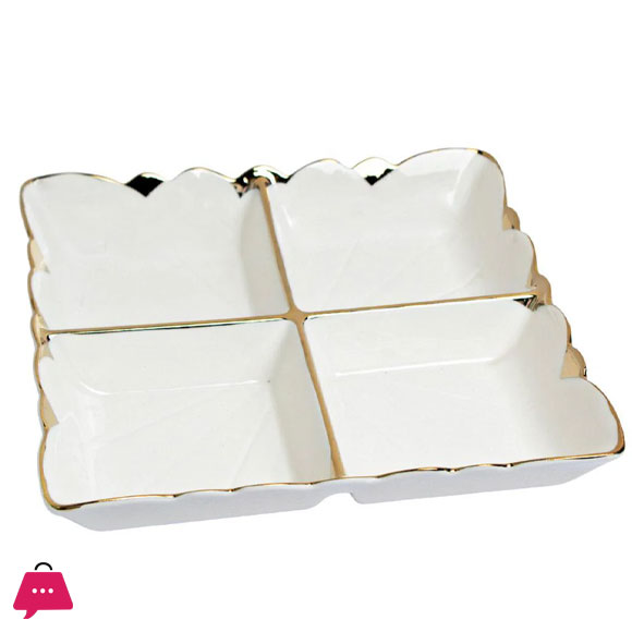 4 Portion Dry Fruit Dish Square Floral Design Ceramic Golden & White