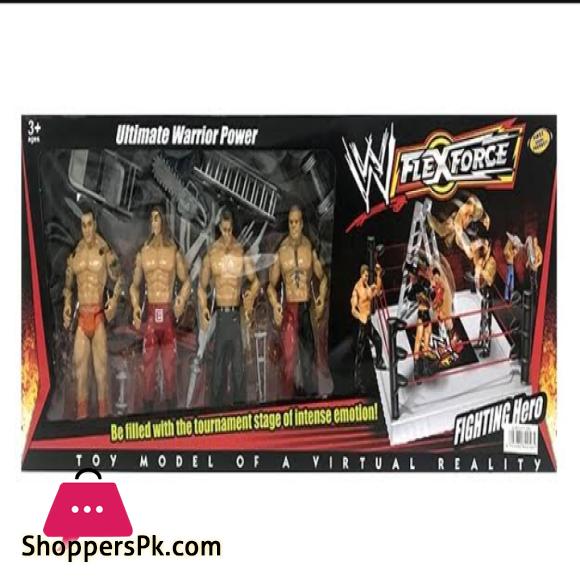 The Ultimate warrior power – 4 action wrestling figures/Toy models with movable arms and legs, includes 7 weapons for creating that virtual brawl inside the ring. Also includes fighting ring with ropes and 4 poles. Unlimited fun for kids highly detailed figures can be made to take beating or hold arms and weapons in there hands. color and contents may vary from illustrations