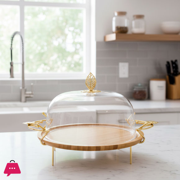 Bamboo Dish with Metal Stand & Plastic Cover-Golden Stand Cake Dish with Cover