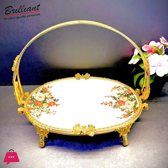 Bring elegance and charm to your home with the BRILLIANT Royal Bloom Deep Serving Platter with Handle. This beautifully designed tray features a luxurious golden frame with a graceful handle and intricate floral detailing — perfect for both serving and decoration.