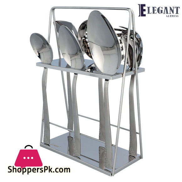 Enhance your tabletop space by styling it with an elegant serving flatware and cookware variety set with subtle golden carving designs along the handles. Comes with a sleek metal-wire rack that displays 6 pieces of silverware, featuring a rice serving spoon, an oval-shaped curry serving spoon, round serving spoons, salad spoon, Spatula and a strainer spoon. Made of 3.0 mm thickness of stainless steel material. Easy to clean and dishwasher-safe. A suitable serving option for formal tableware setting for dinner parties, family gatherings and events.