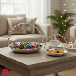 Add a touch of refined elegance to your home with this beautiful silver-plated decorative basket, available in two convenient sizes. Featuring a graceful beaded handle and a polished round tray, this piece is perfect for serving delectable treats, organizing small essentials, or simply enhancing your décor as a sophisticated centerpiece. The reflective silver finish catches the light, bringing a subtle shimmer to any room.