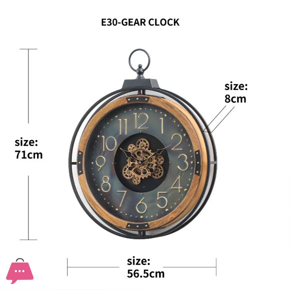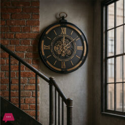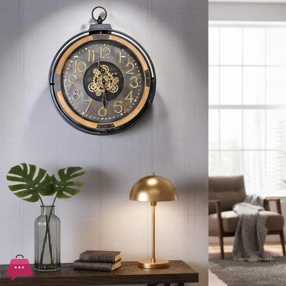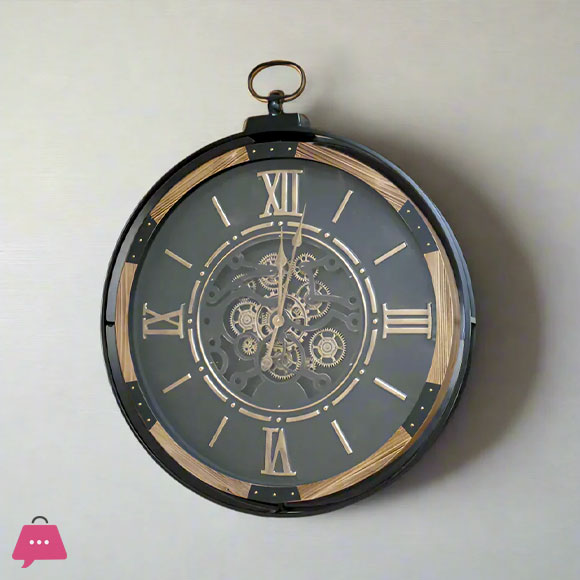 A striking large wall clock designed with a deep black frame, wood accents and brushed antique gold detailing. The visible moving cogs create gentle motion and craftsmanship, bringing depth and character to any interior. A smart, timeless piece that adds presence and an industrial feel to any room, whether in the kitchen, hall or living room.