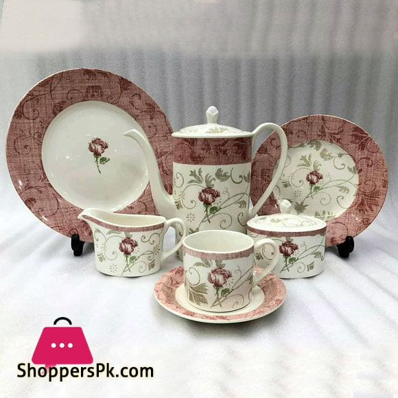 1 Milk Pot, 6 Cups, 6 Saucers, 6 Quartar Plates, 1 Dinner Plate