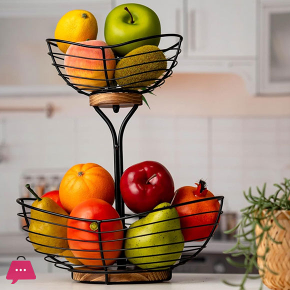 Fruit Basket for Kitchen Countertop,Black Metal Wire with Wood Base,Modern Farmhouse Fruit Bowl,Portable Storage Basket for Kitchen and Dining Room 2 Tier Set
