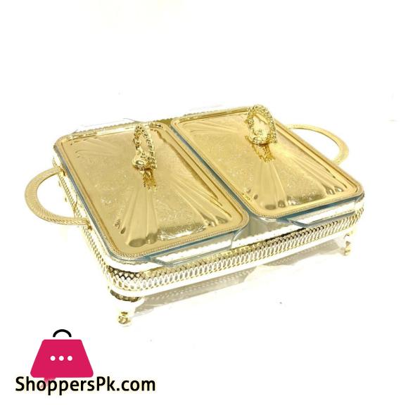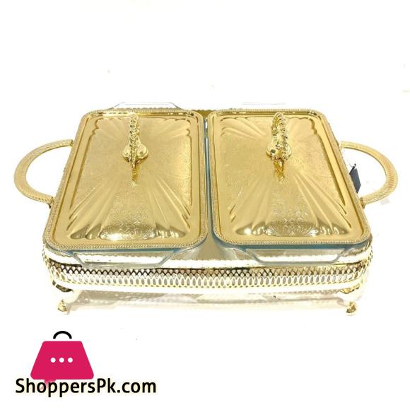Silver Plated Gallery Frame with Handles and Legs. 2 Oblong “Oven to Tableware” Glass Casseroles, complete with Silver Plated Decorative Lids with Diecast Handles.