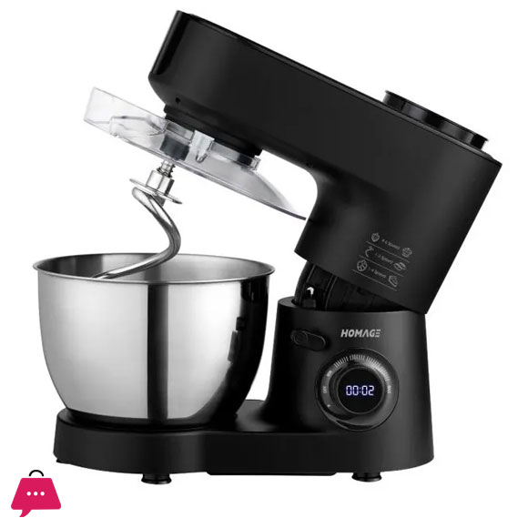This 1000W 3-in-1 kitchen appliance functions as a stand mixer, glass blender, and meat grinder. It features a 6.3L stainless steel bowl, stepless speed control with a display, a rotary switch with a touch panel, essential accessories, an anti-splash cover, and a durable design.