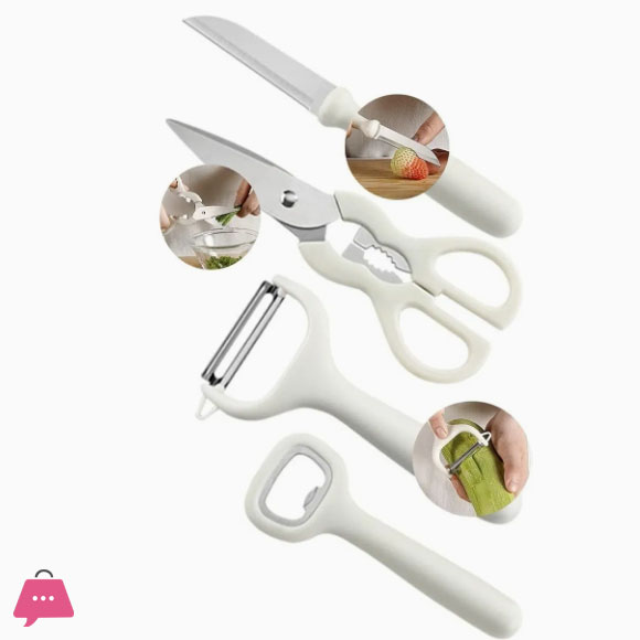 – Comes with a bottle opener, peeler, kitchen scissors and paring knife with a plastic storage base