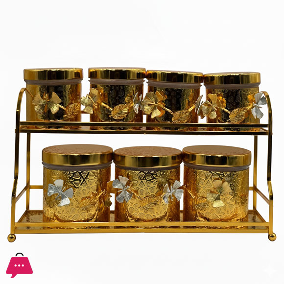 Luxury 8-Piece Gold-Tone Canister Set with 2-Tier Rack Ornate Kitchen Spice, Tea, or Dry Food Storage Jars