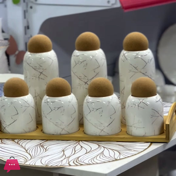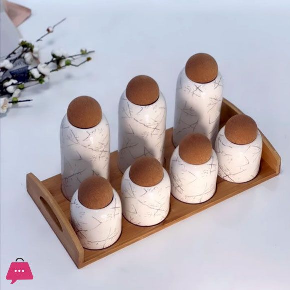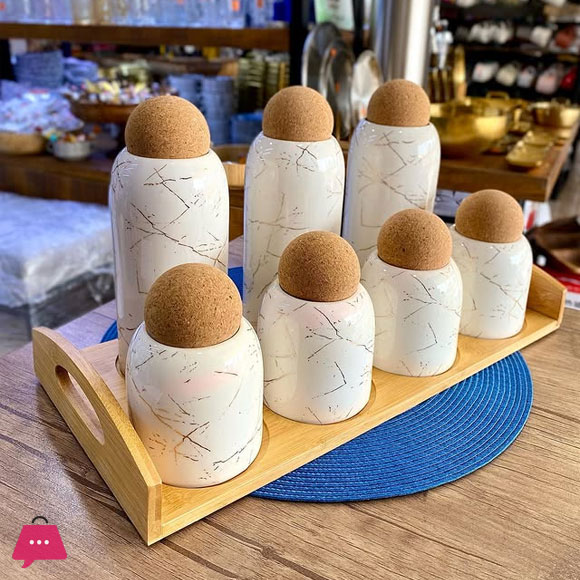 Marble Dsign Ceramic 7 Pcs Jar Set with Bamboo Stand and Cork Lid