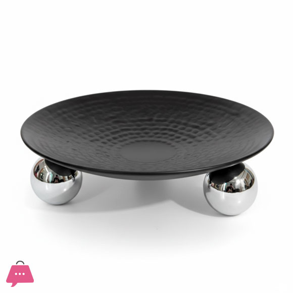 - Design: It features a hammered or textured surface on the main plate and polished, spherical legs.