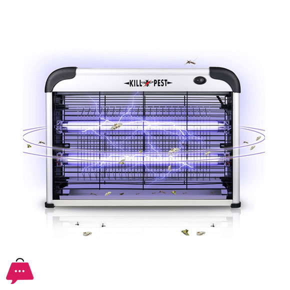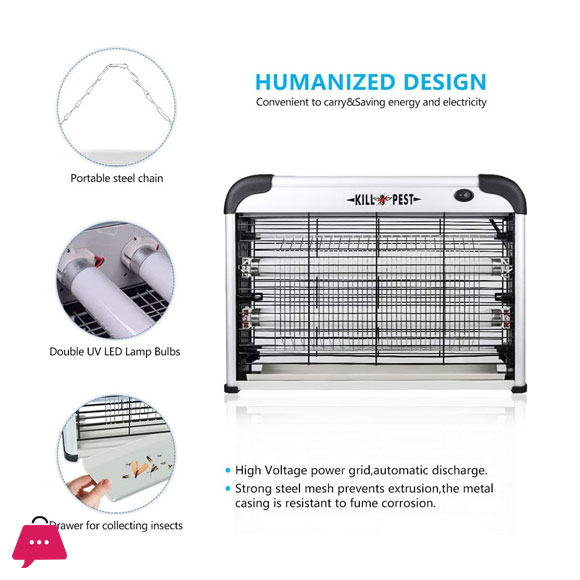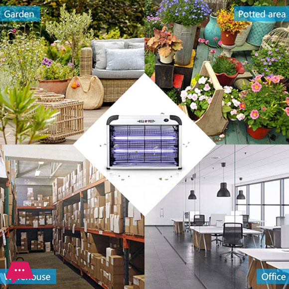 This electronic insect killer emits light with a wavelength of 365 mm through a 20 W fluorescent lamp to attract all types of flying insects such as flies, moths or mosquitoes. They can be electrocuted if they touch a metal network with up to 2000V inside.