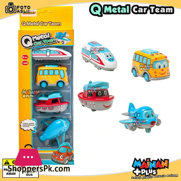 A cute die cast transport toy. 1 set consists of 4 kinds of transportation equipment (depending on type): Airplane, Bus, Boat, Car and Train (see photo).