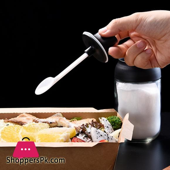 It has 1 design of lid attaches the spoon, in one piece, so you can fetch the seasoning without other spoons once you open the lid.