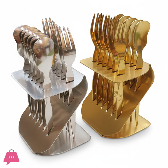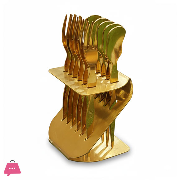 Elevate your dining experience with our elegant 304 Stainless Steel Dessert Spoon & Fork Set. Featuring a unique stand, this gold cutlery collection adds a touch of modern sophistication to any table. Perfect for appetizers, desserts, and everyday luxury.