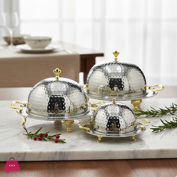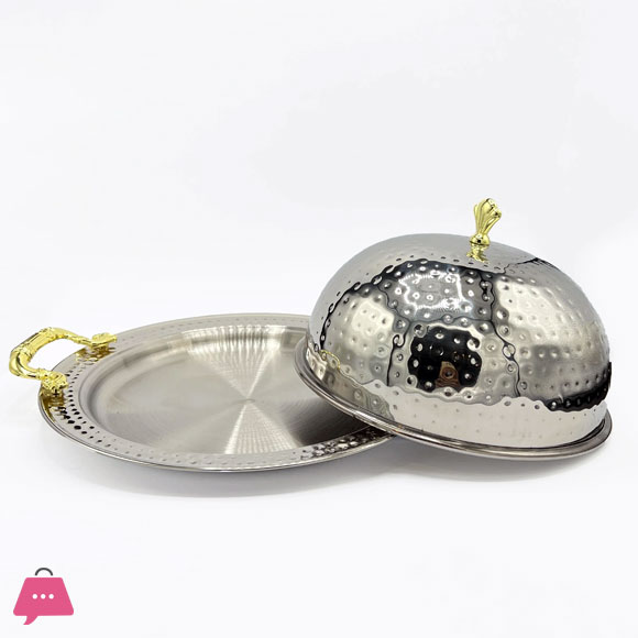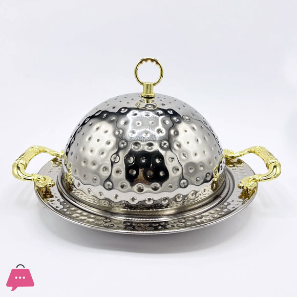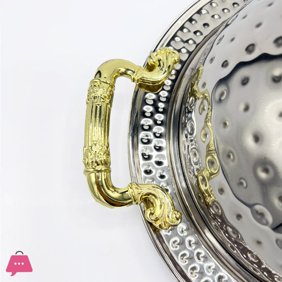 Present your culinary masterpieces with sophistication using our exquisite Dimpled Stainless Steel Serving Platter. Designed for both elegance and functionality, this platter features a unique dimpled texture that beautifully catches the light, complemented by luxurious gold-tone handles and a matching lid finial. Perfect for keeping food warm and making a statement, it’s an ideal addition to any home dining, buffet, or catering setting.