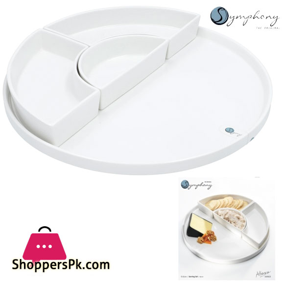 Modern style white serving set of 4, featuring 3 dipping bowls and a large tray. Made up of Ceramic Material. Easy to clean, microwave and dishwasher-safe. Give your table-top a posh aesthetic with this graceful food presentation tray design. Ideal for serving snacks or side dishes to guests at house parties, events, and traditional dawats.