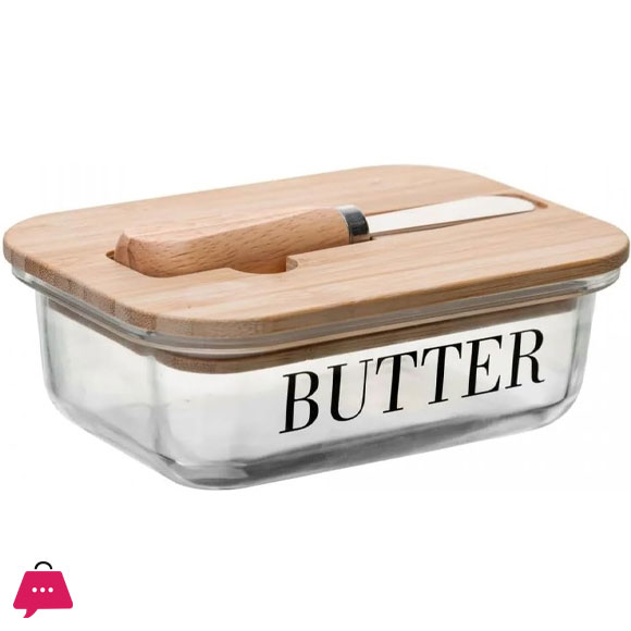 Pyrex Glass Butter Dish with Wood Lid and Knife